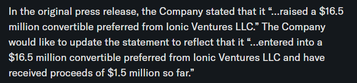 Original claim: “Raised a $16.5 million convertible preferred from Ionic Ventures LLC.”