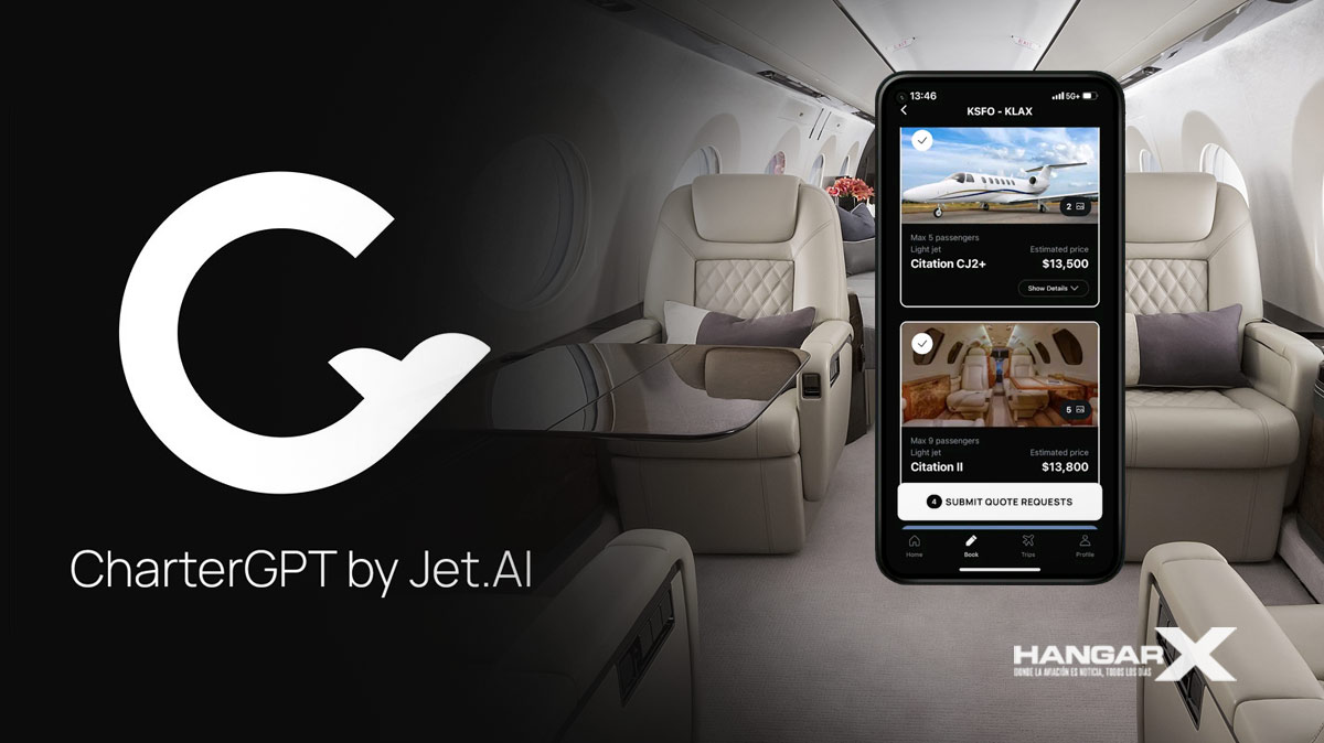 Jet.AI promotes its CharterGPT app as an AI-powered booking tool. The ad shows luxury jet interiors and flight options (e.g., Citation CJ2+ at $13,500). In practice, Jet.AI books third-party flights, records the full ticket price as revenue, and passes most of it to the operator—creating inflated revenue figures but negative gross margins.